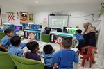 Ketiga : Aktiviti dalam kumpulan dimana pelajar diminta untuk berkumpul di skrin utama untuk latihan Matematik - operasi tambah. Pelajar dapat mengira bersama-sama dan memilih jawapan yang tepat. Kelas diakhiri dengan sesi tayangan video senaman Chicken Dance dan video Didi and Friends.