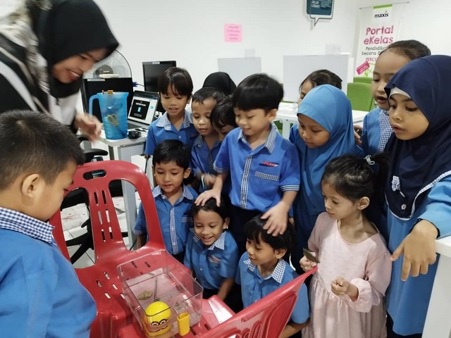 Seterusnya, pelajar diminta berkumpul di hadapan skrin utama untuk melakukan Eksperimen Sains Mudah : Objek Tenggelam dan Timbul dimana pelajar perlu memilih dua jenis objek seperti batu, gunting, duit syiling, daun, pembaris dan sebagainya. Mereka diminta untuk memasukkan barangan tersebut ke dalam bekas yang mengandungi air untuk melihat samada objek tersebut tenggelam atau timbul. Aktiviti seterusnya, petugas menggunakan applikasi Wordwall.net untuk latihan pengiraan bagi subjek Matematik dan sesi diakhiri dengan aktiviti nyanyian serta senaman sebagai aktiviti tambahan.