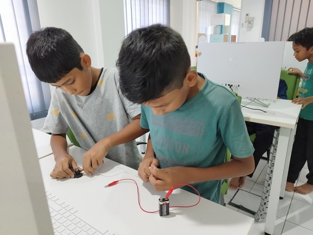 Pada permulaan sesi, petugas membuka tayangan video pembinaan litar elektrik menggunakan applikasi youtube dan memberi tunjuk ajar cara untuk menjayakan eksperimen ini. Pelajar diberikan beberapa bahan seperti wayar, bateri AA, mentol dan pemegang mentol. Mereka diminta untuk menggunakan bahan yang diberikan untuk membina litar elekrik ringkas.